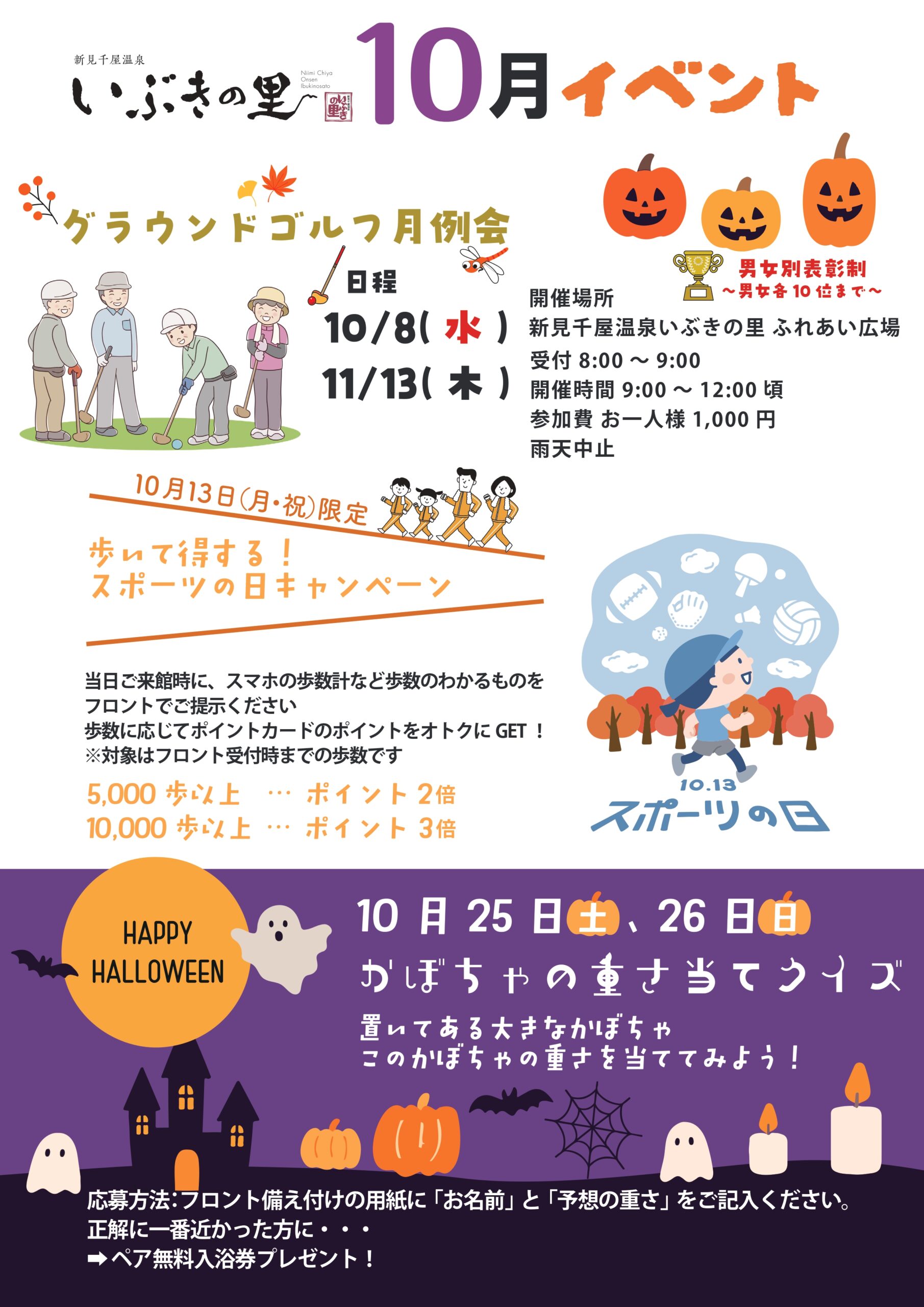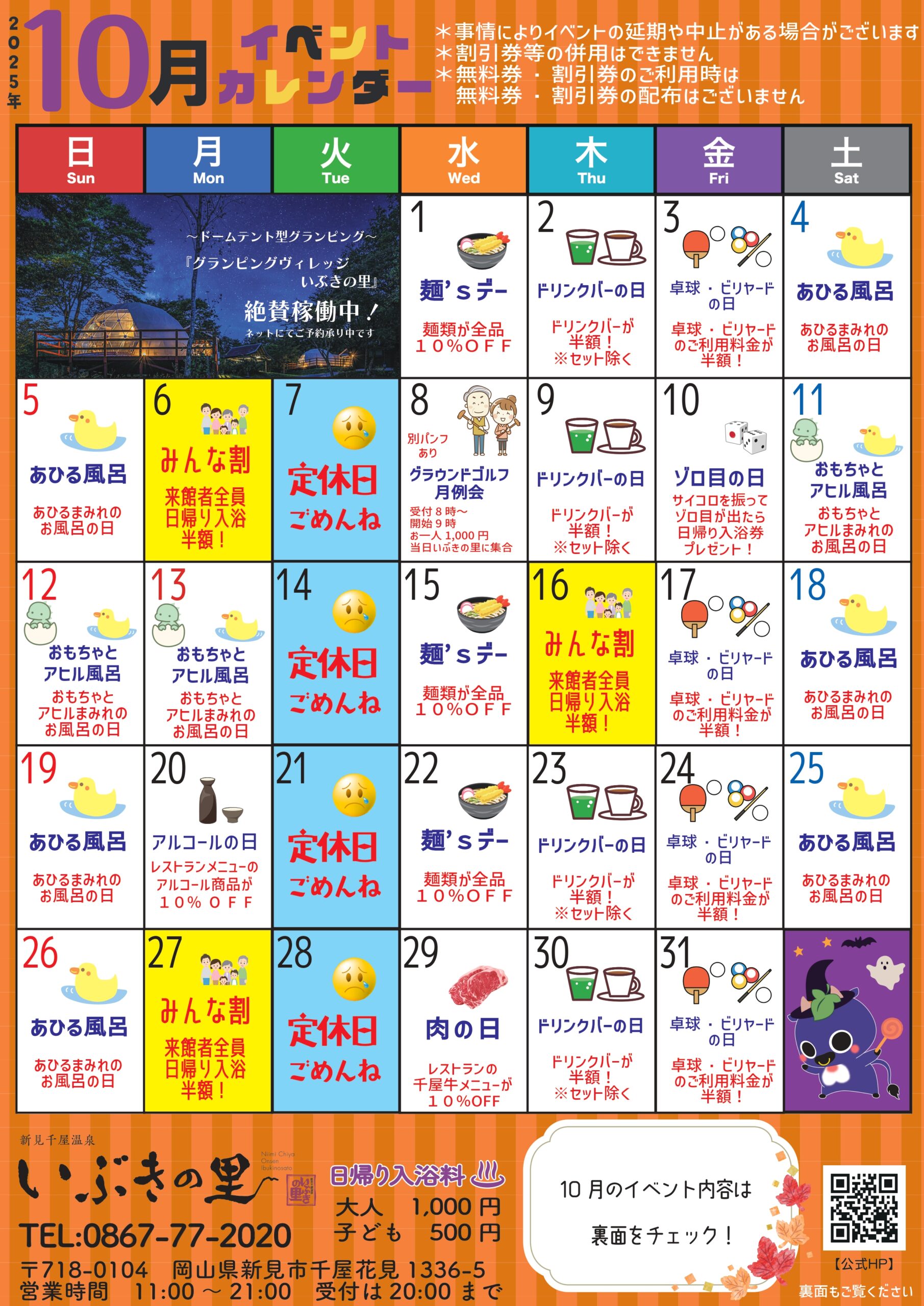 【毎日】2025年10月のイベントカレンダーです 2025.10.01 秋もいぶきの里で心も体もぽかぽかに😊♨️ 添付ファイルからダウンロードしてご活用ください 関連ファイル 2025年10月イベントカレンダー_表 2025年10月イベントカレンダー_裏